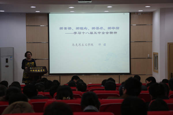 12月22日下午,在104会议室学院党委邀请校“十八届五中全会”精神宣讲团成员、马克思主义学院副院长邓谨副教授作了题为《新目标、新理念、新要求、新举措》的宣讲报告。学院教职工90多人参加了报告会。赵延安书记主持报告会。
