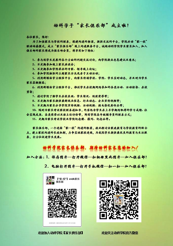 为了加强家长与学校的联系,搭建沟通的桥梁,提供交流的平台,加快学生全面成长,动科学院精心准备策划,启动“家—校”联动培养模式,成立“家长俱乐部”微信群线上沟通服务平台,受到学生家长高度认可,成立初期已有近100位家长加入俱乐部。