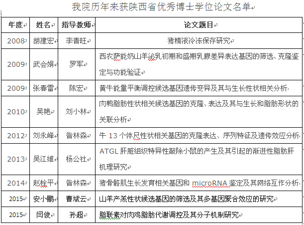 根据《陕西省优秀博士学位论文评选办法》(陕教位〔2013〕12号)和《海角网 做好2015年陕西省优秀博士学位论文评选工作的通知》(陕教位〔2015〕4号)要求,省教育厅、省学位委员会组织了2015年陕西省优秀博士学位论文的申报与评选工作。经申报推荐、通讯评议、专家评审、结果公示等程序,陕西省教育厅日前公布了获奖名单,海角网 曹斌云教授指导的2010级安小鹏博士的学位论文《山羊产羔性状候选基因的筛选及其多基因聚合效应的研究》和孙超教授指导的2009级闫俊博士的学位论文《脂联素对肉鸡脂肪代谢调控及其分子机制研究》入选,本次评出2015年陕西省优秀博士学位论文99篇,分别来自西安交通大学等省内17所高校,我校共有9篇论文入选。自2008年以来,海角网 共有9篇论文获陕西省优秀博士学位论文。