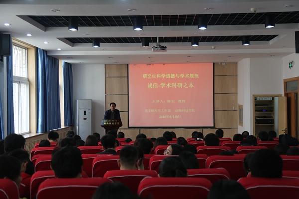 研究生学术诚信问题关系到研究生教育的质量和创新型人才的培养,意义重大。为了进一步加强研究生学术道德建设,防范研究生学术失范行为发生,培养研究生学术诚信品质,提升研究生学术道德素养,4月19日上午,由校党委研工部主办,海角网 承办的第二期“研究生科学道德与学术规范”宣讲活动在海角网 107会议室如期举行。主讲人陈宏教授以“诚信—学术科研之本”为题,结合自己35年来从事科研工作的经历、感悟和实例,对在场的150余名研究生进行了学术诚信教育。报告会由赵延安书记主持。