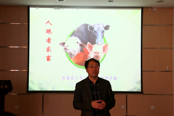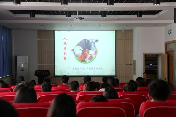 整场报告会,欧百钢处长主要围绕人类日常生活与家畜的关系、家畜起源与人类驯化、家畜在人类经济体系中的作用、科技教育等方面进行了分析讲解。他借助世界各国传统习俗和历史、地理知识,向大家介绍了家畜从古至今在人类的吃、穿、住、行、用等方面扮演的重要角色,我国家畜品种的地理分布和进化历程,以及家畜在人类经济和社会文化进步中起到作用,并以H7N9事件为例,肯定了畜牧学科在中国农业和经济发展中所发挥的重要作用。