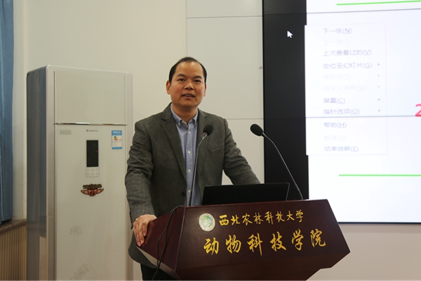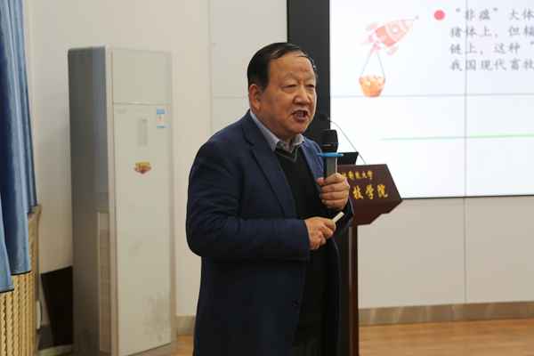 11月27日,学院在107会议室举办“非瘟背景下‘猪禽互动’与健康养殖”主题报告,家禽精准营养与健康养殖团队负责人高玉鹏教授应邀担任主讲人,100余名师生参加了报告会。会议由学院党委书记曹军会主持。