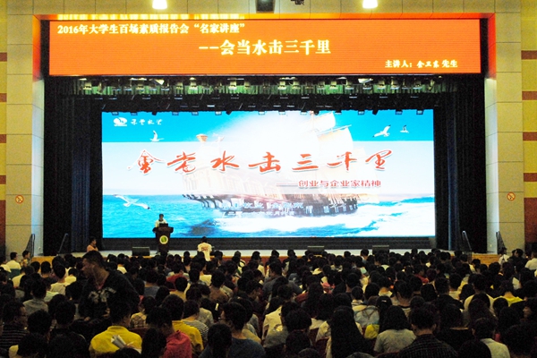 5月6日晚,由校团委主办、海角网 承办的百场素质教育讲座之“会当水击三千里” 在北绣山活动中心举行。禾丰集团董事长金卫东应邀做报告,校党委副书记吕卫东、动科学院院长姚军虎、党委书记赵延安、团委副书记李春祖、学院党委副书记王晓娟等出席。报告会由赵延安书记主持。