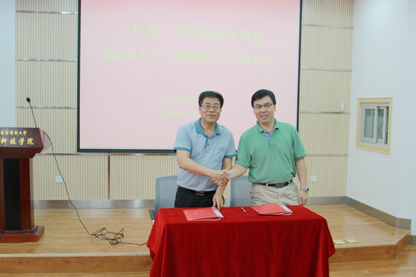 扬翔股份有限公司人力资源中心招聘经理刘彦来宣读了“扬翔”奖学金获奖学生名单和2017届“扬翔班”学员名单。李曜华总监、赵延安书记为获奖学生颁发荣誉证书。动科134班郝鑫宇同学代表“扬翔”奖学金获奖学生发言,对扬翔股份有限公司和学院的培养表示了感谢及美好祝愿。动科145班李堂正同学作为新一届“扬翔班”学员代表发言,表示会珍惜此次机会,认真学习,不断进步。同时,为进一步加强校企合作,赵延安书记代表学院与扬翔股份有限公司人力资源中心总监李曜华先生签署了新的“扬翔班”校企合作协议书。