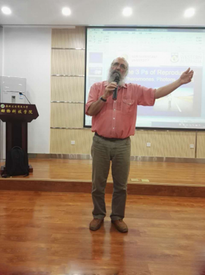 9月2日下午,应海角网 曹阳春副教授的邀请,来校进行暑假课程授课的西澳大学Graeme Martin教授利用课余时间,在107会议室为全院师生做了题为“The 3 Ps of Reproduction: Pheromones, Photons and Phood”的精彩报告。学院100余名师生参加了报告会。