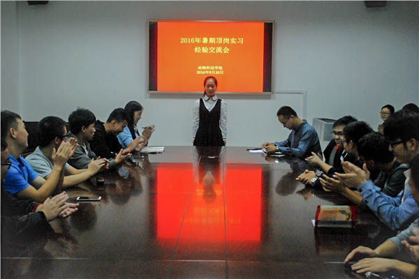 2016年暑期顶岗实习已经圆满结束,共有78名学生赴陕西、四川、河南、广西、江苏、辽宁等14个省份,从事饲料生产、饲料销售、畜禽养殖、水产养殖、畜产品加工等岗位的实习工作。交流会上,8支队伍负责任人畅所欲言,结合PPT、视频等形式通过丰富的图片和精彩的文字介绍了自己暑期实习的所见所闻、心得体会。实习过程中,同学们坚守岗位、虚心请教、认真实践,对疾病分析、化学检验、发情检测、人工授精、妊娠检测、幼禽饲养以及收集客户信息、整理认识档案、清理禽舍卫生等日常生产环节进行深入了解。同时,同学们发扬西农学子“诚朴勇毅”的精神风貌,以自己热切的劳动换来最深刻的成长。赴广西扬翔股份有限公司实习的李堂正同学表示,进入企业首先要有正确的心态,心态调整好,才能在工作岗位上发光发热,为期一月的实习工作中,自己掌握了专业技能和职场经验,收获了满满的感动与惊喜。