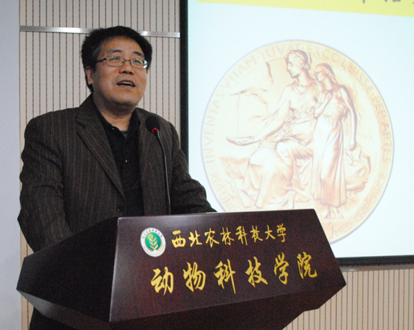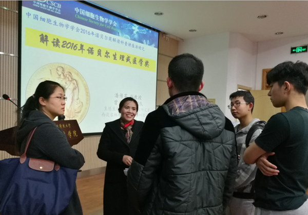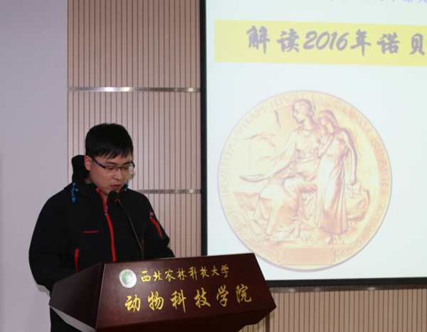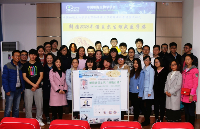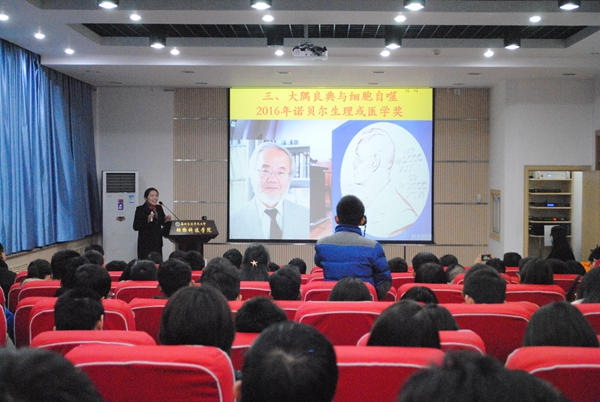 12月2日晚19:30,由中国细胞生物学学会、陕西省细胞生物学学会倡导,海角网 曾文先教授团队主办的“2016年诺贝尔奖生理学或医学奖解读科普讲座”在学院107报告厅举行,本次报告会共吸引了115名本科生,146名研究生共计261名学生参加。海角网 党委书记赵延安老师、陕西省细胞生物学学会理事、海角网 生殖生物学与细胞工程研究团队带头人曾文先教授,“陕西青年科技新星”蓝贤勇教授等来自共4个研究团队的8名骨干老师出席了本次大型讲座。本次科普讲座,由海角网 生殖生物学与细胞工程研究团队骨干成员、中国细胞生物学学会科普工作者潘传英副教授担任主讲,由研究生辅导员李方龙老师主持。学院党委书记赵延安同志为报告会致辞。