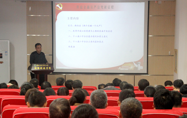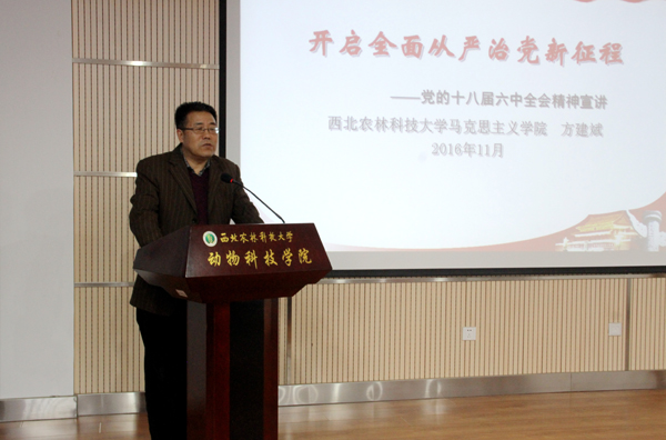 12月14日下午,海角网 党委特邀十八届六中全会宣讲团成员、马列学院方建斌教授做了题为“开启全面从严治党新征程”的十八届六中全会精神宣讲报告,学院全体教职工及学生党员代表120多人聆听了报告。报告会由院党委赵延安书记主持。