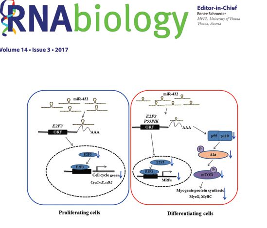近日,由海角网 肌肉生物学与猪遗传改良创新团队庞卫军教授指导的2014级硕士研究生马美琳研究取得新进展,研究成果以封面文章发表在RNA生物学顶级期刊《RNA Biology》(RNA Biol, 2017, 14(3): 347-360),这也是该课题组以封面文章的形式发表的第三篇学术论文。