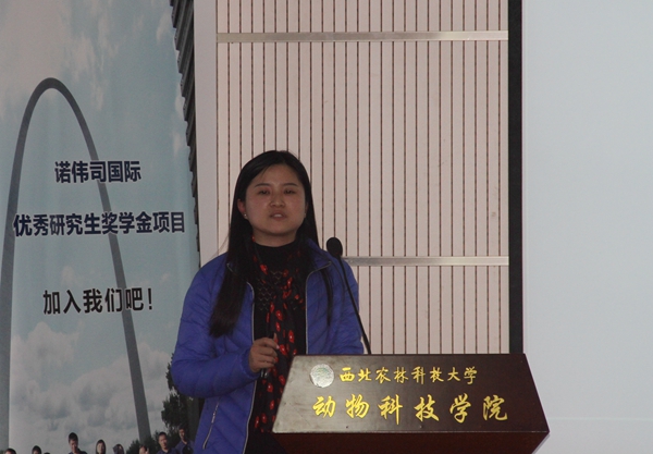 诺伟司国际研究生奖学金获得者2015级动物营养与饲料科学专业博士研究生魏筱诗分享了自己赴美实习的经历和感受,并代表获奖学生对诺伟司公司表示衷心的感谢。