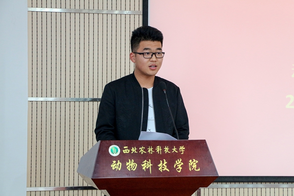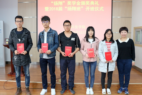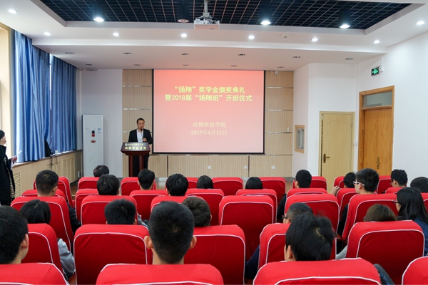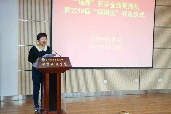 扬翔股份有限公司人力资源中心招聘经理刘彦来宣读“扬翔”奖学金获奖学生名单和2018届“扬翔班”学员名单。王晓娟副书记、刘彦来经理为获奖学生颁发荣誉证书。动科156班雷杰同学作为新一届“扬翔班”学员代表发言,表示会珍惜此次机会,认真学习,不断进步。