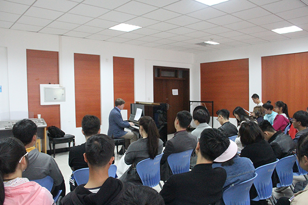 同时,学院充分把握机遇,借助Ian Lahiffe先生的音乐才华与求学背景,为本次就业大学堂上开设第二分会场,举办了一场别开生面的微型音乐分享会。正如音乐会主题所言:“每个人心中都有一首歌”,音乐无国界,唯爱永相随。 “音乐,是最美好的教育方式”,Ian Lahiffe先生用美妙的钢琴与优美的歌声交流文化,传递力量,音乐会特邀嘉宾老师们以及与会同学们也纷纷献唱,现场氛围愉快和谐。