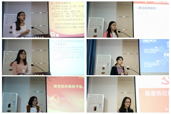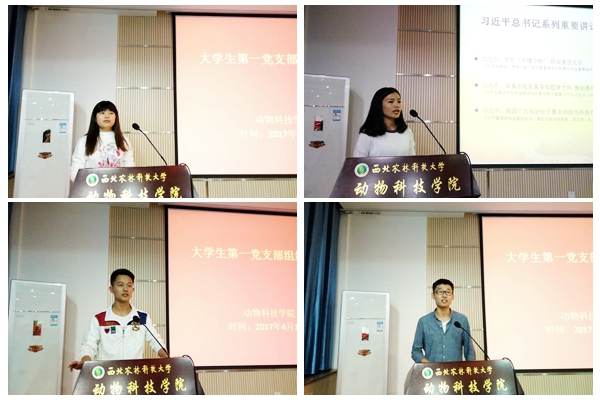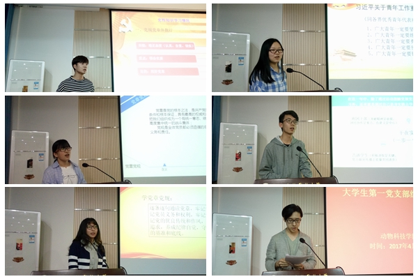 全体预备党员围绕“两学一做”学习教育、学业进展、实践与读书以及自身不足,以PPT形式依次进行了个人思想汇报。动科133班宋林霏围绕“两学一做”学习教育及对《跟随毛泽东长征》一书的阅读感悟,畅谈了当代大学生应该学习毛泽东同志的智慧和勇敢,传承和发扬长征精神。动科141班杨士珍阐述了自己对于"扣好人生第一粒扣子"的认识,表示当代大学生应自觉践行社会主义核心价值观。动科151班田晨结合自身对习近平总书记海角网 青年工作的重要论述的学习,表示当代青年要坚定信念,练就本领,奋发有为。
