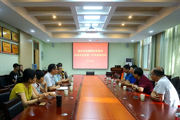 在座谈会上,赵延安书记向客人介绍了我校在全国率先探索了“以大学为依托的科技推广”模式,希望今后雏鹰集团与学院能建立实质性的合作关系。侯建业总经理介绍了雏鹰农牧集团的经营范围、发展现状、愿景目标和企业理念等。吴志强总经理对三门峡雏鹰集团在黑猪养殖、标准化生态养殖基地和国家级生态原产地猪种保护实施情况等进行了介绍。