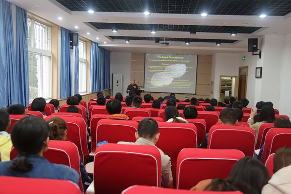 首先,Axel Hartke教授简要介绍了卡昂大学的发展历史与院系分布情况。随后,Axel Hartke教授重点就自己的科研进展及研究成果进行了汇报,他的研究内容主要包括抗菌肽对肿瘤细胞的杀灭作用,从而为治疗肿瘤疾病提供新的方法。Gérard Barroso教授主要从新型镰刀菌的快速筛选鉴定,毒素作用机理及调控措施以及真菌与食品安全的关联等方面的进行了系统的讲解。整场报告会座无虚席。会上,与会师生就相关问题与两位教授进行了充分的交流。两位教授的报告开阔了学院师生对于抗菌肽与菌体的视野,对从事相关研究的师生有重要的借鉴作用。