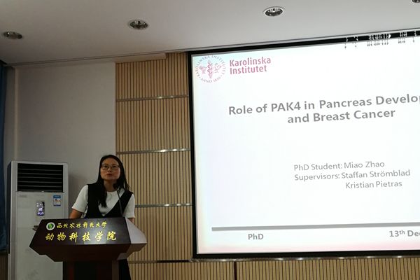 赵苗博士主要围绕PAK4的功能及其胰腺癌和乳腺癌中作用进行讲述。她利用转基因小鼠来研究基因功能,发现当PAK4全身敲除时会导致小鼠胚胎期死亡,为此,利用Cre/loxp系统选择性地在胰腺中敲除PAK4;胰腺敲除PAK4小鼠研究表明,在胰腺中敲除对胰腺没有造成可以识别的损伤。同时,她利用定量质谱技术、免疫沉淀 (IP)、大数据分析等方法系统鉴定了PAK4 相互作用蛋白以及PAK4新功能。此外,还揭示了PAK4 在乳腺癌中的作用,通过各种的体外、体内实验证明了PAK4 降低可以增加衰老的过程,从而减慢肿瘤发生。在报告会结束后,赵苗博士与雷初朝教授、蓝贤勇教授等教师和研究生就本次报告内容的有关问题、瑞典博士培养答辩、出国留学等问题进行了深入而广泛的学术交流。