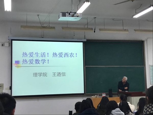 “人生最宝贵的是生命,而我整个生命和全部精力都奉献给了世界上最伟大的事业—全人类的解放而奋斗。”王迺信教授从我校建校开始,讲述了在校史中那段坎艰难坎坷的岁月里兢兢业业为教育而奉献了一生的“大家”。在讲述的过程中,王迺信教授向同学们展示了许多珍贵的手书诗稿与信件,通过他所讲解的西农人和西农事,同学们对校史校情有了更深的了解,更是对昔日那些在学术和教育领域作出巨大贡献的老前辈们肃然起敬。