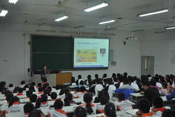 在8T08教室报告现场,郑以博士以通俗易懂的语言,并结合漫画、图片、动画、纪录片等多种方式,生动地向大家讲述了生命的由来、精卵结合、胚胎发育等过程,以及干细胞的特点和在临床上的应用,有效地激发了同学们对生命科学深入学习的欲望。郑以博士的讲话内容深受同学们的喜爱,时不时爆发出的激烈掌声,使得现场师生互动融洽,气氛活跃。
