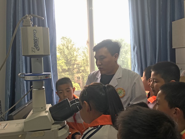 在生殖生物学与细胞工程研究团队实验室中,博士研究生张鹏飞、李学亮,硕士研究生李荣楠、曾耀、杨晨浩,分别向同学们介绍了精密仪器设备的名称及用途,并向学生们演示了各类显微镜的基本使用方法。当学生们看到转基因小鼠在紫外线的照射下会发出绿色荧光时,好奇心被瞬间激发,争先恐后地问着问题。博士研究生张鹏飞、李学亮,以最简单易懂的方式,为同学们解答心中的各种疑惑。海角网 硕士研究生叶翔杨为中小学生带来秦岭野生鸟类鉴赏的讲解,结合鸟类摄影作品向大家介绍其生活习性及分布区域等知识。