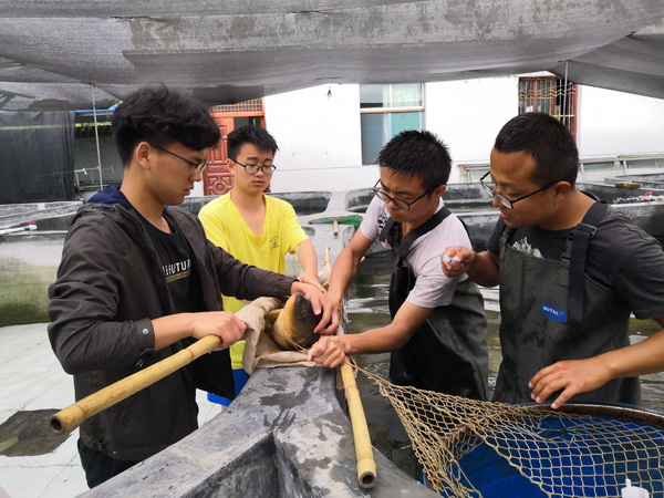 实习过程中,实习生们根据实习内容要求,参与了试验站的池塘日常管理、鱼类人工繁殖、苗种培育和商品鱼养殖等试验示范工作,在人工催产、胚胎发育观察、生石灰清塘、鱼病检测等关键技术环节都亲手操作,真正做到了在实践中学,学以致用。同学们表现出不怕脏不怕累的昂扬风貌,女生和男生一样,积极参与搬运饲料、下水清塘等工作,受到试验站工作人员的普遍赞扬。除在站实习外,试验站还组织实习生到安康市汉滨区恒润生态养殖有限公司参观了甲鱼生态养殖情况,到安康市汉滨区金螺生态渔业农民专业合作社参观了瀛湖网箱匙吻鲟不投饵养殖情况等,实习生们对不同养殖模式及产业一线的状况有了切身的感受。
