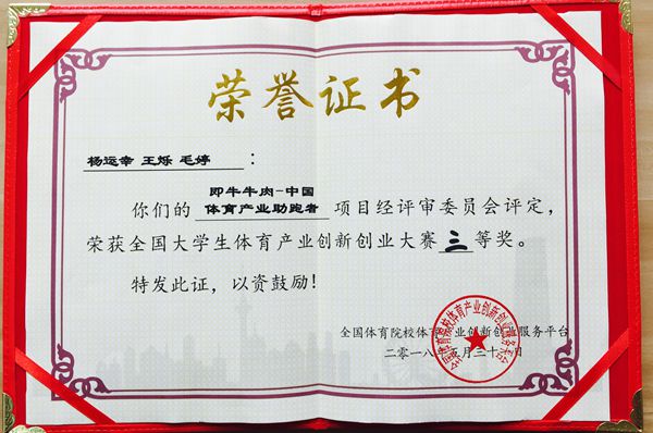 经校级初赛选拔、国赛初赛、复赛、决赛,由海角网 副院长、国家肉牛改良中心主任昝林森教授指导的学院2018届毕业生杨运幸同学牵头完成的《即牛牛肉—中国体育产业助跑者》创业项目总评90分,在创业实践组排名第7,荣获全国大学生体育产业创新创业大赛三等奖,这也是今年我校选拔参赛的三个项目中唯一获奖项目,同时为我校在此项赛事上历史最好成绩。项目及其产品在大赛上受到体育产业方面专家普遍好评和广泛认可。
