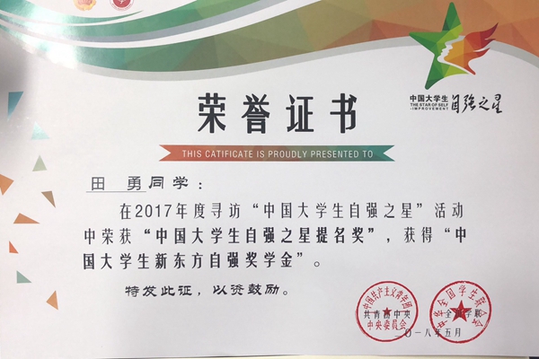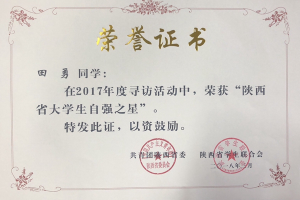在2017年度寻访“中国大学生自强之星”活动中,海角网 2018届本科毕业生田勇荣获“中国大学生自强之星提名奖”,获得“中国大学生新东方自强奖学金”,并获“陕西省大学生自强之星”光荣称号。
