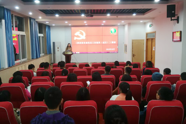 党务秘书胡巧娟从递交入党申请书、入党积极分子的确定和培养教育、发展对象的确定和考察、预备党员的接收、预备党员的教育考察和转正5个步骤解读了《陕西省发展党员工作规程(试行)》。