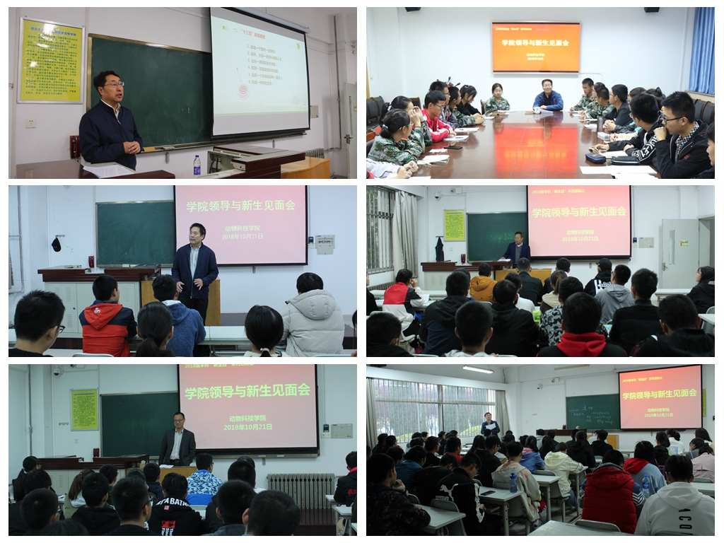 “新生日”活动中,学院全体在校院领导“倾巢出动”,分别深入到不同班级与新生见面,并与同学们交流畅谈。学院党委书记赵延安在与动科1801班同学座谈时讲到,要充分认识所学专业,清楚“是什么”与“做什么”,并督促同学们抓好英语、数学等基础课程的学习,加强写作水平的锻炼,为今后开展深层次的科学研究打下牢固的基础。院长姚军虎教授系统介绍了动物科学专业的现况、畜牧业发展方向以及学院的本科生培养方案,鼓励同学们注重实践,锻炼技能,多参加集体活动,致力全面发展。副院长孙超教授希望同学们不断探索,找准自己感兴趣的方向并朝着目标一步步迈进。副院长赵运良希望同学们拥有梦想、学会学习、学会生活,做一名品学兼优的大学生。党委副书记王力要求同学们做好学业规划和职业规划,正确处理课堂学习与课外活动的时间、处理好当学生干部与学习的关系,努力提升自身综合素质和能力。副院长凌飞教授鼓励同学们树立终身学习的理念,有机会要继续深造,提升学历层次,在专业上有所建树。