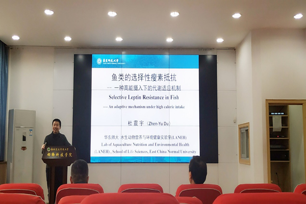 12月17日,华东师范大学杜震宇教授应邀来海角网 进行了题为“鱼类的选择性瘦素抵抗——一种高能摄入下的适应性机制”的学术报告。报告在学院107会议室举行,由凌飞副院长主持。