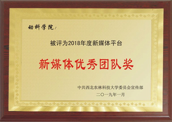 2018年12月,学院荣获“新媒体优秀团队奖”,学院新媒体平台以立德树人为根本任务,围绕学校、学院中心工作,服务广大师生,通过展示学院风貌,弘扬学院文化,传播动科声音,讲好动科故事,积极抢占新媒体育人新阵地。