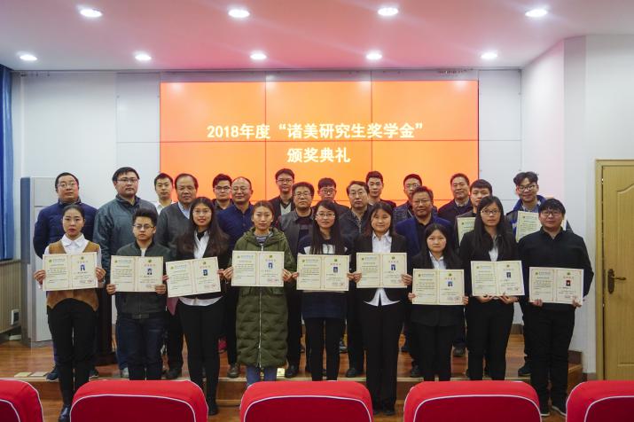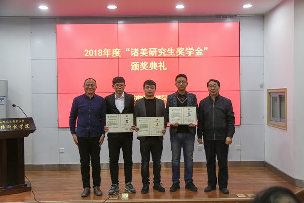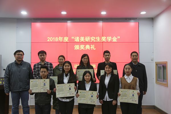 为支持研究生教育事业发展,促进优秀研究生脱颖而出,河南省“诸美”种猪育种集团有限公司自2017年起设立“诸美”研究生奖学金。奖学金分为科学研究、技术研发和管理服务三类。每类分别设一、二、三等奖,奖金分别为5000、3000、2000元。意在资助学院学术基础扎实、发展潜力较大并取得突出科研成果的优秀研究生。杨公社教授代表“诸美”奖学金评审委员会宣读了2018年“诸美”奖学金的评选结果。其中“科学研究类”奖学金获得者7人,“技术研发类”奖学金获得者5人,“管理服务类”奖学金获得者6人。与会嘉宾为蔡瑞等18名获奖者颁发了获奖证书和奖金。
