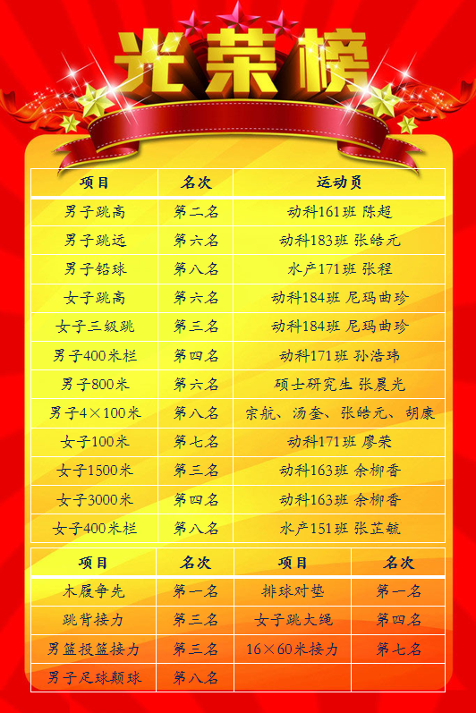 4月19日,学校2019年田径运动会在北校区田径场落下帷幕,动科学子顽强拼搏,在各方面人员短缺的情况下获得男女团体总分第八名、女子团体总分第七名的好成绩,同时获得学生精神文明奖和阳光体育运动先进单位。
