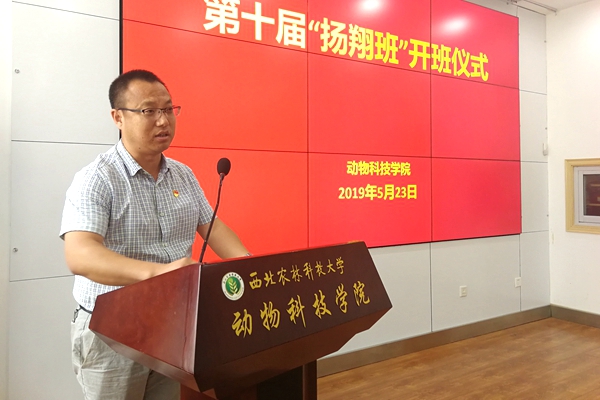 5月23日下午,学院在107会议室举行第十届“扬翔班”开班仪式。扬翔股份有限公司人力资源副总监刘彦来,校友、招聘经理助理陈令祥,学院党委副书记王力,全体专兼职辅导员及“扬翔班”学生代表参加会议。会议由辅导员冯来顺主持。
