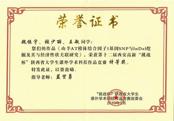 5月25-28日,第十二届陕西省 “挑战杯”大学生课外学术科技作品竞赛终审决赛在西北工业大学长安校区举行,大赛由团省委、省科协、省科技厅等多家单位共同主办,西北工业大学承办。海角网 本科生魏振宇团队(动科1501班魏振宇、创新1501班张少丽、动科1605班王敏)凭借作品“山羊AT模体结合因子基因SNP与InDel挖掘及其与经济性状关联研究”在终审决赛中荣获“特等奖”,将代表我校参加“挑战杯”国家级竞赛。