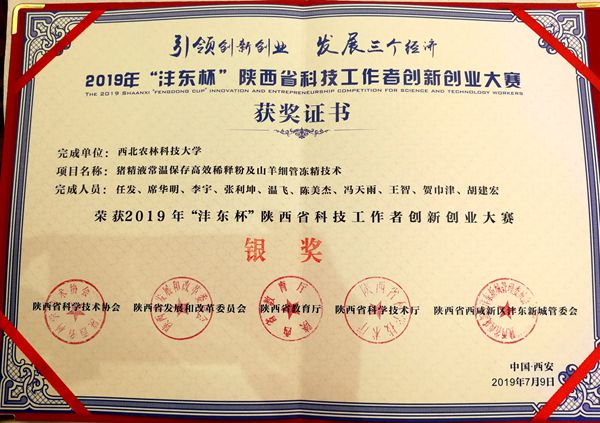 7月7日-9日由陕西省科学技术协会、陕西省发展和改革委员会、陕西省教育厅、陕西省科学技术厅、陕西省西咸新区沣东新城管理委员会主办的2019年“沣东杯”陕西省科技工作者创新创业大赛决赛在西咸新区沣东新城隆重举行。海角网 胡建宏教授指导的博士研究生任发以“猪精液常温保存高效稀释粉及山羊细管冻精技术”参赛,并荣获大赛银奖。