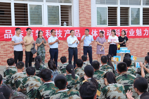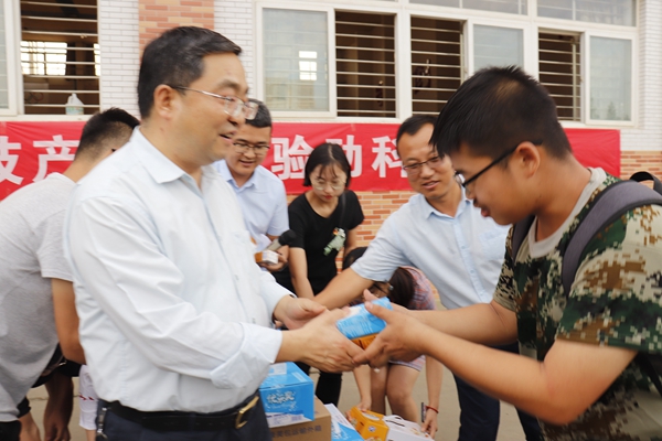 擦一把汗,品一口花生牛奶、一口原味酸奶,开心的笑容绽放在动科7连、8连学子略显疲惫的脸上。8月30日下午,全国人大代表昝林森教授,学院党委副书记王力,全体专兼职辅导员赴军训场亲切慰问2019级新同学,并带来了昝林森教授团队与西安银桥乳业集团产学研合作的畜牧科技产品,让新生在军训场零距离体验专业魅力。