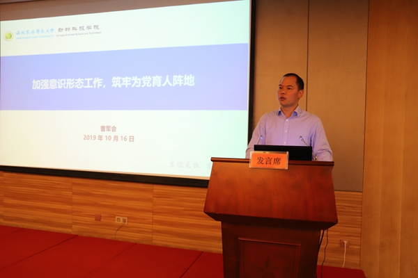 曹军会从四个方面介绍学院意识形态工作的具体做法和经验成果。一是强化顶层设计,抓牢意识形态工作领导权。通过健全工作机制、压实工作责任、建强工作队伍等措施,巩固意识形态工作的“根据地”和“桥头堡”,坚守“主阵地”,种好“责任田”,旗帜鲜明地站在意识形态工作第一线。二是强化思想引领,掌握意识形态工作主动权。抓实科学理论武装,构建“党委理论中心组学习、教职工学习、学生党员学习、学生团员学习”的学习格局,积极推进习近平新时代中国特色社会主义思想入脑入心;抓好“先锋育人工程”“文化育人工程”“实践育人工程”三大育人工程,引领学生淬炼“诚朴勇毅”的高尚品格,践行西农精神。三是严格底线思维,掌控意识形态工作话语权。加强课堂阵地、文化阵地和校园网络阵地管理,构筑抵御宗教渗透“防火墙”,实现课程门门有思政、教师人人讲育人,把文化活动打造成为育人的平台,让新媒体平台始终高举旗帜,围绕中心、服务大局,师生树立正确的国家观、民族观、宗教观。四是加强文化建设,营造意识形态工作良好氛围。凝练“畜德自牧,富饶天下”的学院文化,举办畜牧先贤百年诞辰大力弘扬科学家精神,开展丰富多彩的文化活动统一思想、凝聚共识,汇聚学院发展正能量。