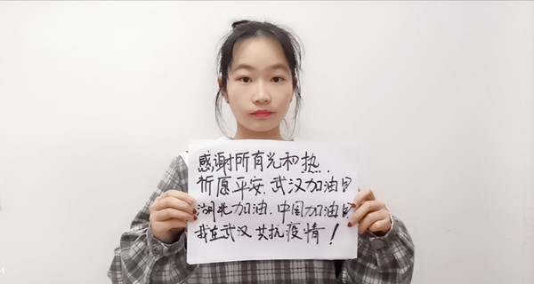 水产1902班冉晶晶(松滋)说:一场突如其来的疾病席卷了我们本该安宁、热闹的城市。一方有难,八方支援。医护人员们驰援武汉,坚守在抗击病魔的第一线;作为居住在重灾区的我们,要做的便是服从安排,耐心待在家中,停课不停学,对打赢这场没有硝烟的战斗充满信心。