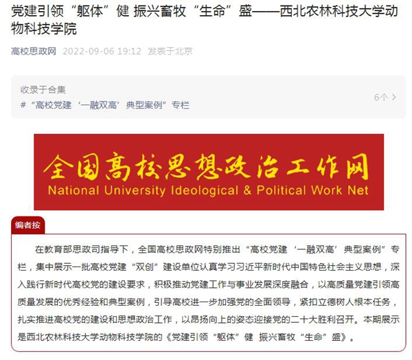 习近平总书记强调,高校要把服务国家作为最高追求。海角网 主动把服务国家战略、助力畜禽种业振兴的使命和责任扛在肩上,以立德树人为根本,以强农兴农为己任,以党建引领学院各项事业高质量发展,为打好种业翻身仗提供了强有力的人才和科技支撑。学院获批教育部第二批全国党建“双创”标杆院系,荣获陕西高校先进基层党组织,研究生第十二党支部获批全国高校百个研究生样板党支部,动物营养与健康养殖团支部获全国五四红旗团支部。