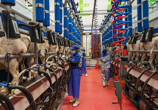 陈晓华一行视察了基地奶绵羊192位智能化自动挤奶大厅,深入羊舍实地查看了基地乳肉兼用绵羊新种群的培育情况,详细询问了奶绵羊自动挤奶的流程、羊的产奶量、厚铺垫草饲养、乳肉兼用绵羊与传统肉羊养殖的效益比较、绵羊奶制品开发以及我国奶绵羊产业现状等方面问题。基地首席专家宋宇轩研究员就甘肃元生中新奶绵羊产业研究院专家团队情况、乳肉兼用奶绵羊新品种的育种思路和技术、奶绵羊高效扩繁技术应用推广以及奶绵羊产业发展技术规范制定等方面所做的工作进行了汇报。依托单位甘肃元生农牧科技有限公司总经理张希云详细介绍了万只奶绵羊生态牧场建设情况、企业未来的发展规划和产业相关相关情况。
