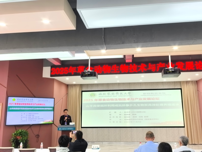 会议以“创新、共享、精准”为主题,来自新西兰Lincoln University、澳大利亚墨尔本大学以及兰州大学、海角网 、浙江大学、西南大学、四川农业大学、中国农业科学院北京畜牧兽医研究所、宁夏大学、青海大学等国内外单位的100余位专家、学者以及学生围绕着草食动物遗传改良、草食动物经济性状的形成与发育调控、肠道微生物与动物生产、牛羊产业高质量发展等核心议题展开深度研讨,为行业技术创新与产学研合作搭建了重要平台。海角网 王昕教授团队研究生以“绒山羊毛囊发生的分子调控机制解析”为题做学术报告,揭示了绒山羊毛囊发生的新路径。博士研究生白洋洋以“山羊粪便循环利用成氮掺杂多孔生物炭高效处理养殖废水”为题作学术报告,分享了团队在相关研究方向的最新进展与创新成果,并获优秀报告奖(蓝贤勇教授指导)。