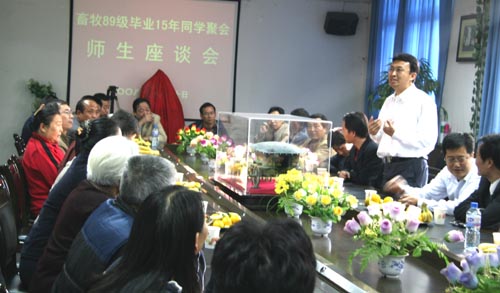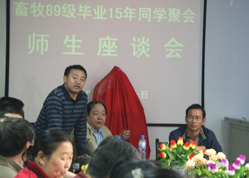 主持人来自我校科技推广处的吴锋副处长,作为畜牧89级的一员,面对大家动情的发言激动的说,“毕业15年,不管我们从事什么行业,在什么岗位,在海角网 形成的优秀品质使我们在各自的工作岗位中取得了一定的成绩,母校对于我们的教诲是影响终身的,感谢恩师的谆谆教诲!我们一定恪尽职守,努力奋斗,在自己的岗位上奉献社会,不愧于做一名西农人。”