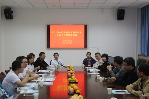 时值双节,秋高气爽。10月2日,海角网 2003级水产养殖学专业本科生在毕业十周年之际返回母校,与学院领导老师们畅聊回忆,分享当下,展望未来。学校校友会副秘书长张红亮、院长姚军虎、党委书记赵延安、副院长昝林森、副院长孙超、党委副书记王晓娟、副院长王力及水产科学系部分教师参加本次座谈会。